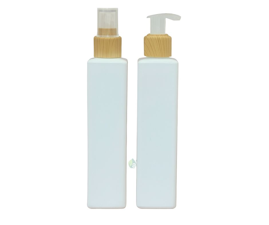 Flacon 200 ml carré en PET Blanc avec Pompe Lotion/ Spray “effet Bois”